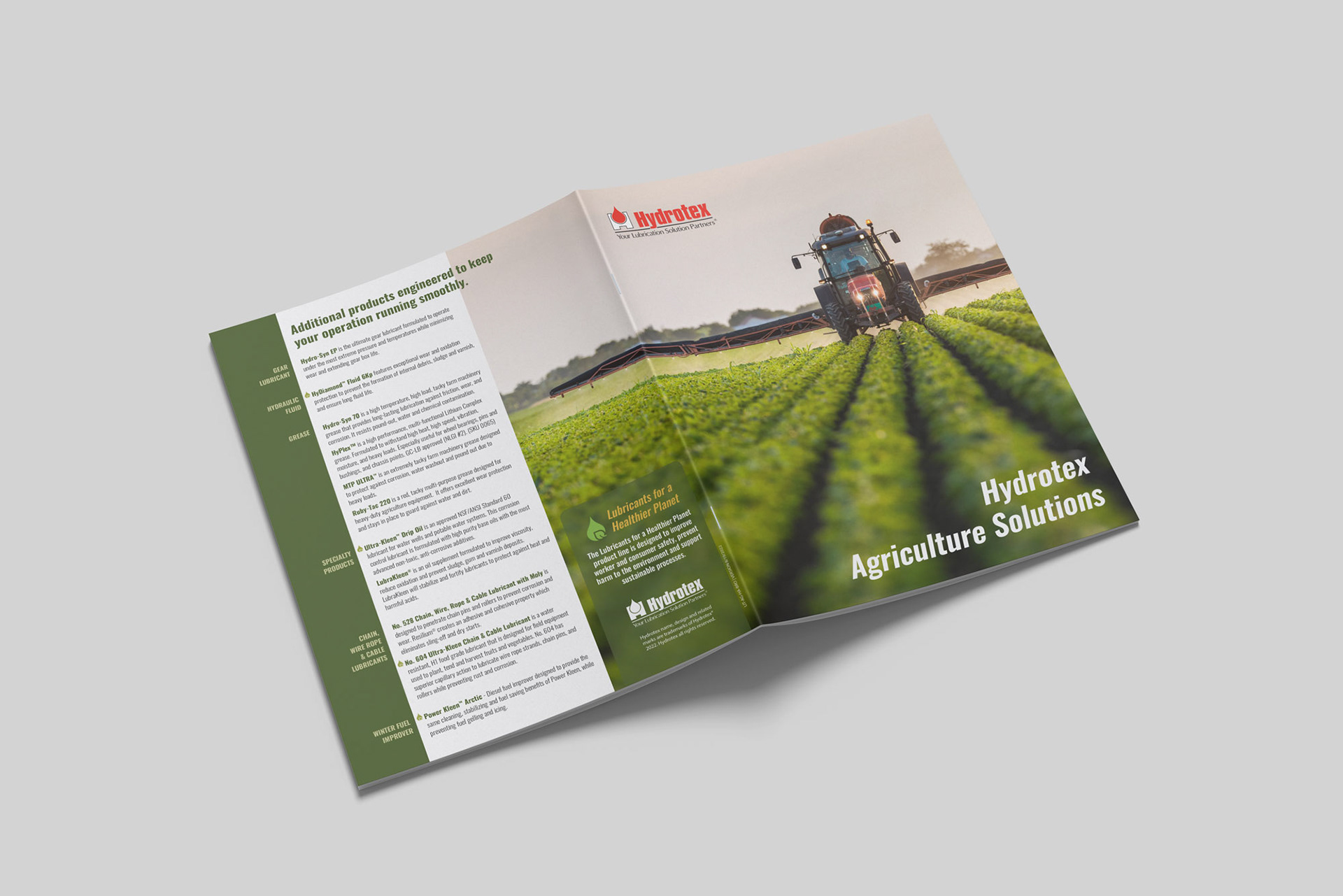 8.5" x 11" bi-fold brochure highlighting the solutions that Hydrotex offers for the agriculture market.