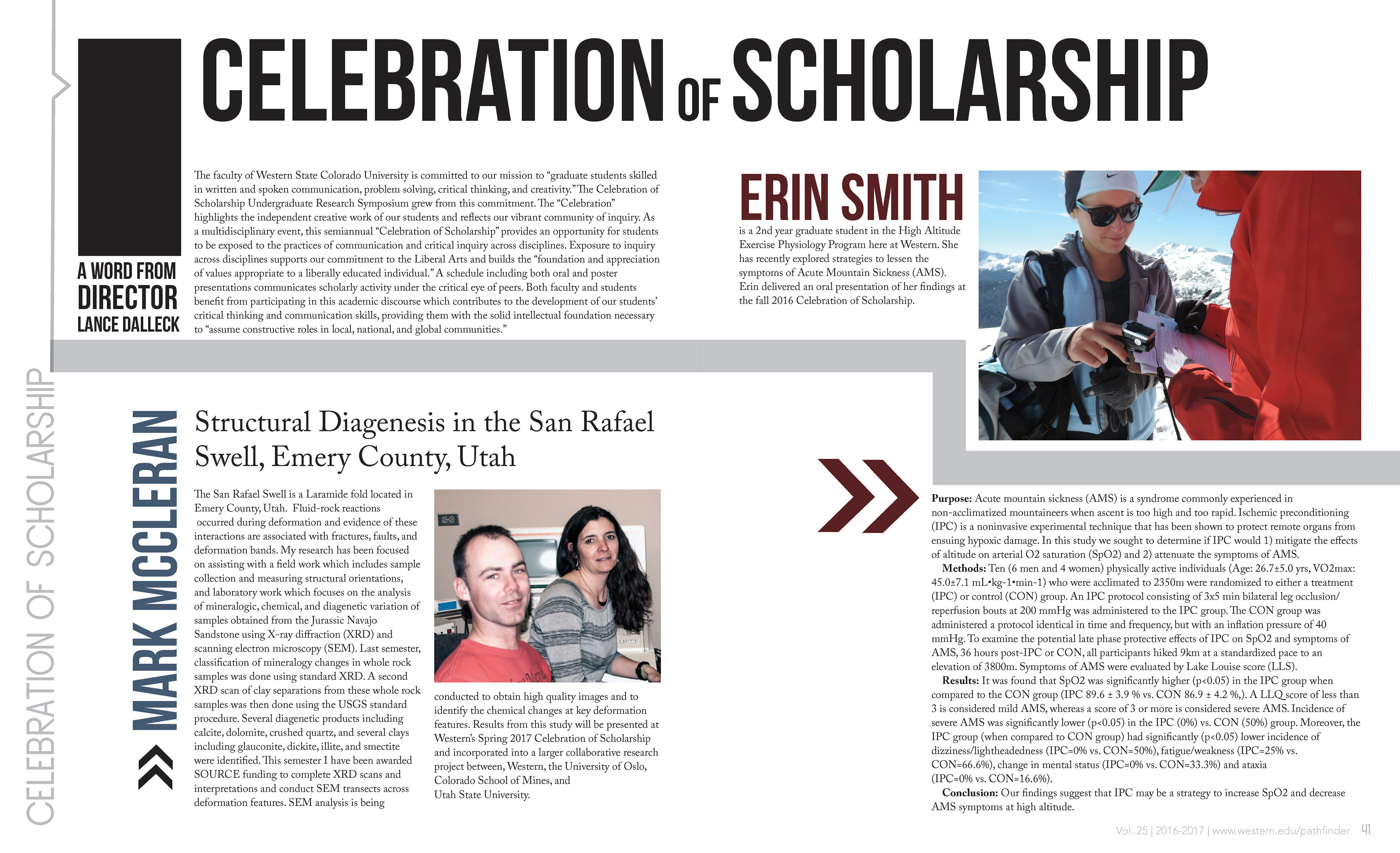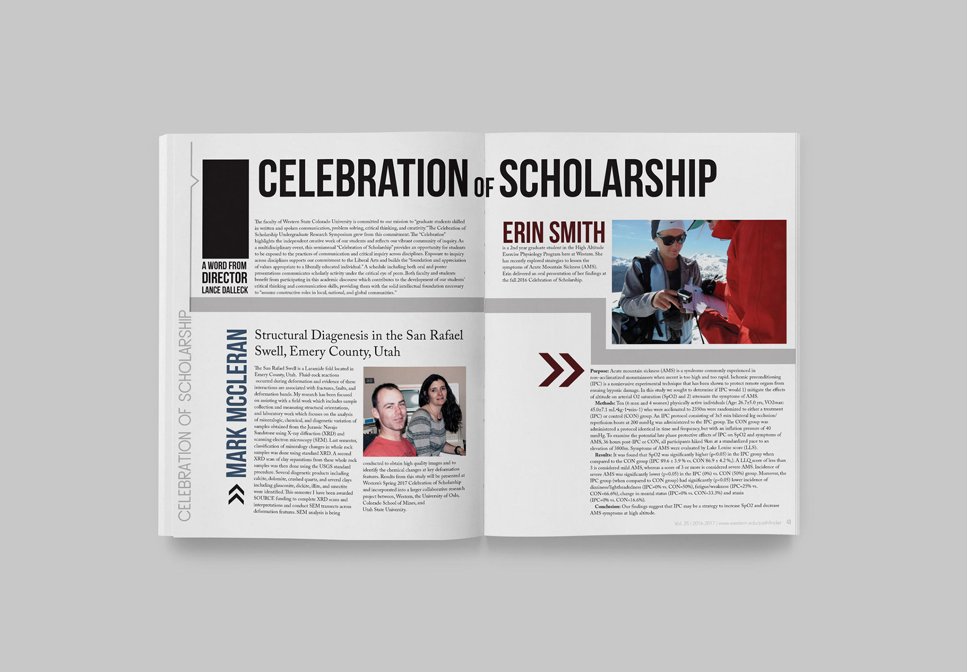 Four page spread and a single page design from the 2016-2017 issue of Pathfinder Magazine, an annual year-in-review publication created by design students at Western State Colorado University.